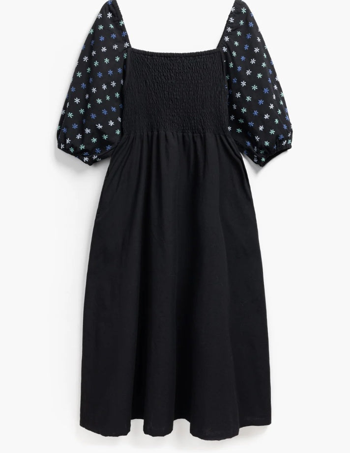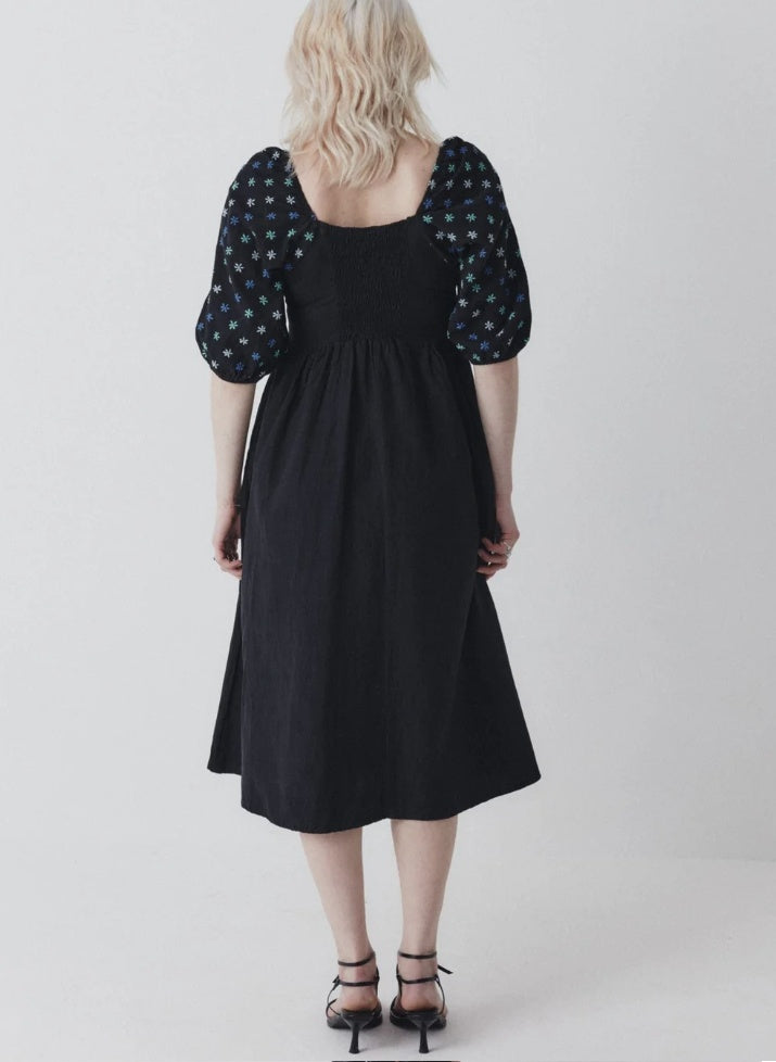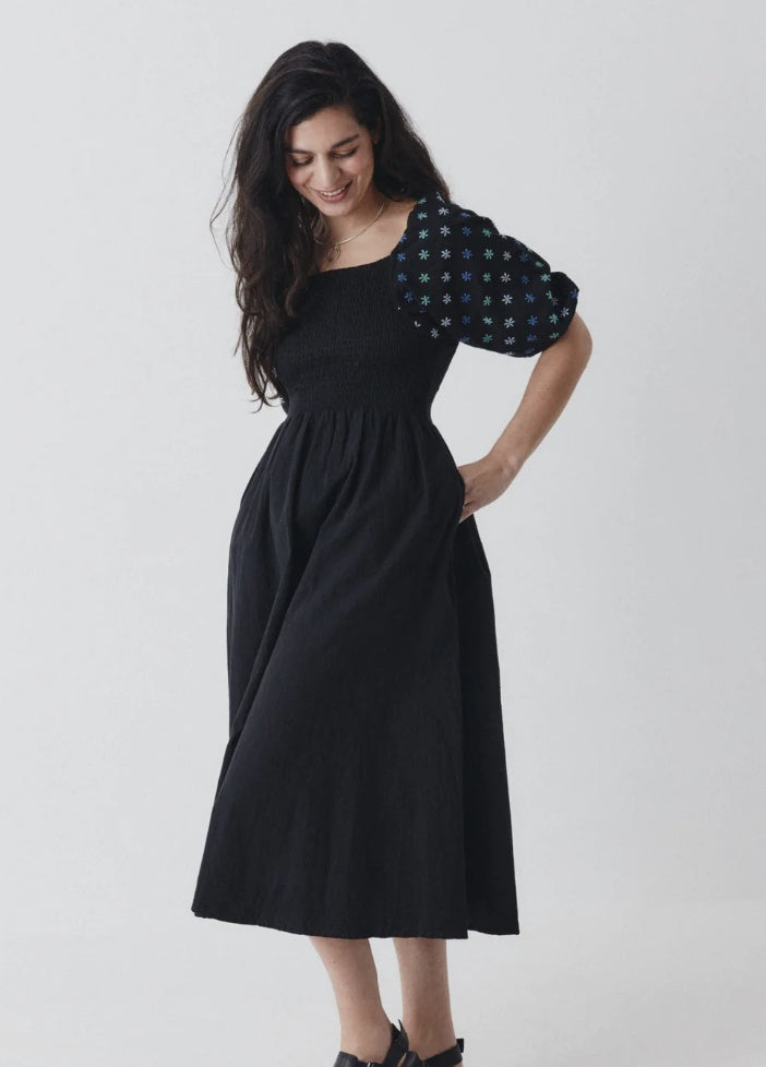 Musta Belle - käsinkirjottu mekko on uusi ehdoton luottovaate. Hengittävästä luomupuuvillasta käsintehdyssä mekossa on tyylikkäät puhvihihat, koristeellinen käsinkirjonta ja imarteleva rypytetty yläosa. Midi-pituuden ja sivusaumataskujen ansiosta tämä mekko yhdistää tyylin ja käytännöllisyyden, joten se on helppo valinta rentoon menoon tai viikonlopputapaamisiin.